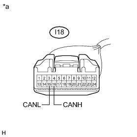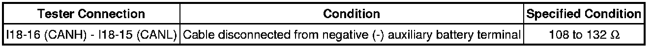 * Before measuring the resistance of the CAN bus, turn the power switch off and leave the vehicle for 1 minute or more without operating the key, switches or opening or closing the doors. After that, disconnect the cable from the negative (-) auxiliary battery terminal and leave the vehicle for 1 minute or more before measuring the resistance.
