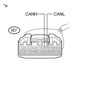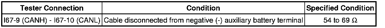 * Before measuring the resistance of the CAN bus, turn the power switch off and leave the vehicle for 1 minute or more without operating the key, switches or opening or closing the doors. After that, disconnect the cable from the negative (-) auxiliary battery terminal and leave the vehicle for 1 minute or more before measuring the resistance.