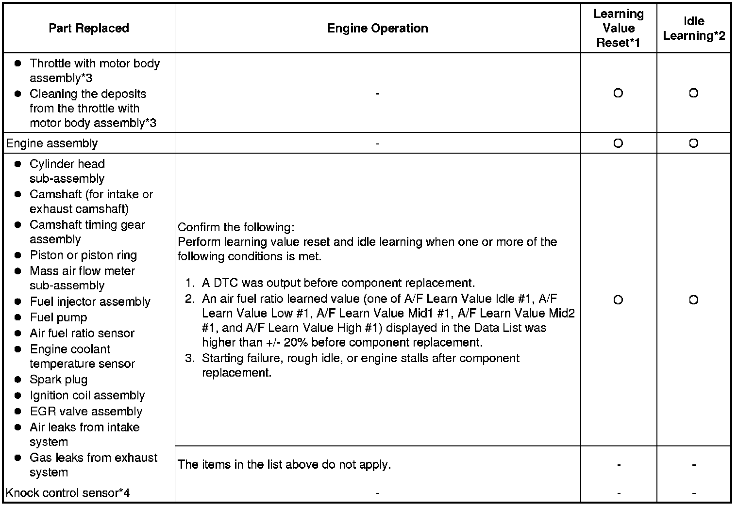 Perform learning value reset and idle learning after replacing or servicing parts related to engine operation. Details on procedures required are indicated by an asterisk and a number, and are explained in detail following the table.