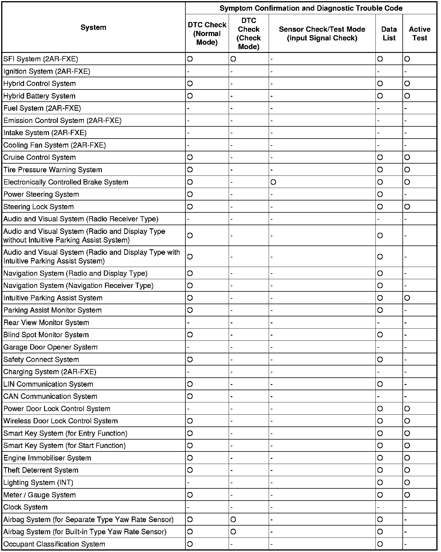 When no DTC is output but the problem still occurs, use the Problem Symptoms Table. The suspected areas (circuits or parts) for each problem symptom are shown in the table. The suspected areas are listed in order of probability. A description of each of the table columns is shown in the following table.