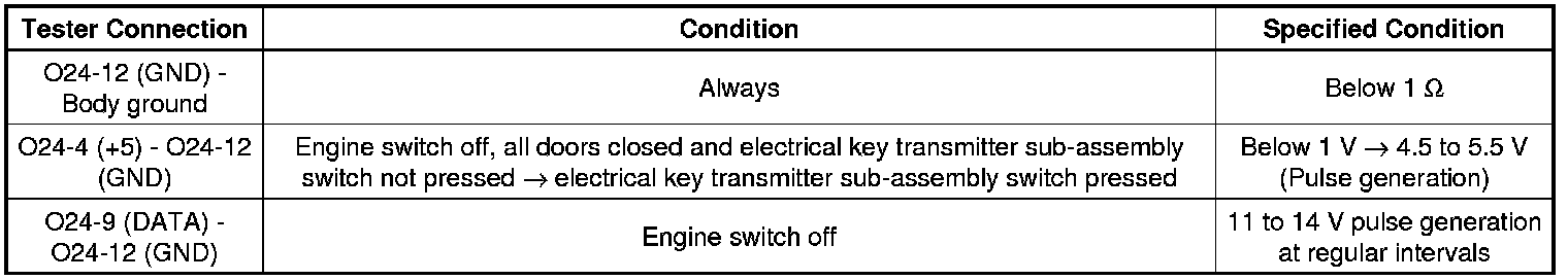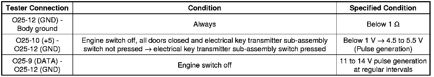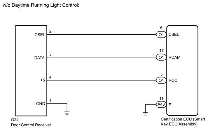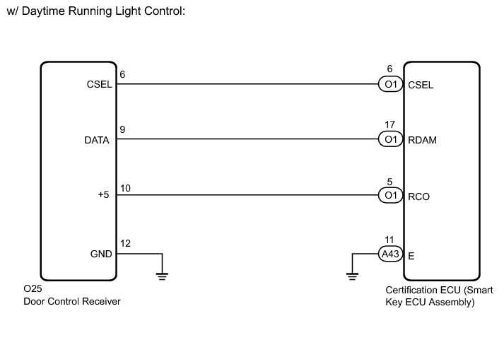 The door control receiver is used to receive radio waves relating to the entry functions of the electrical key transmitter sub-assembly. The certification ECU (smart key ECU assembly) decodes the requested electrical key transmitter sub-assembly by identifying a key code based on the radio waves received via the door control receiver. The door control receiver receives a signal from the electrical key transmitter sub-assembly and sends signals to the main body ECU (multiplex network body ECU) through the certification ECU (smart key ECU assembly). The certification ECU (smart key ECU assembly) then sends a command, according to the requested operation, to each ECU (ex. if door lock operation is requested, the certification ECU (smart key ECU assembly) sends a door lock command to the main body ECU (multiplex network body ECU)).