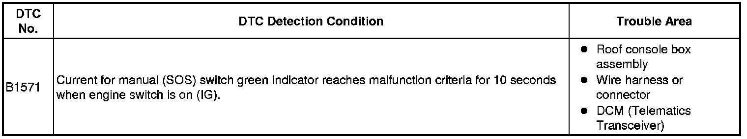 This DTC is set when the DCM (Telematics Transceiver) detects an open or short in the manual (SOS) switch green indicator circuit of the manual (SOS) switch. The manual (SOS) switch green indicator illuminates after the engine switch is turned on (IG).