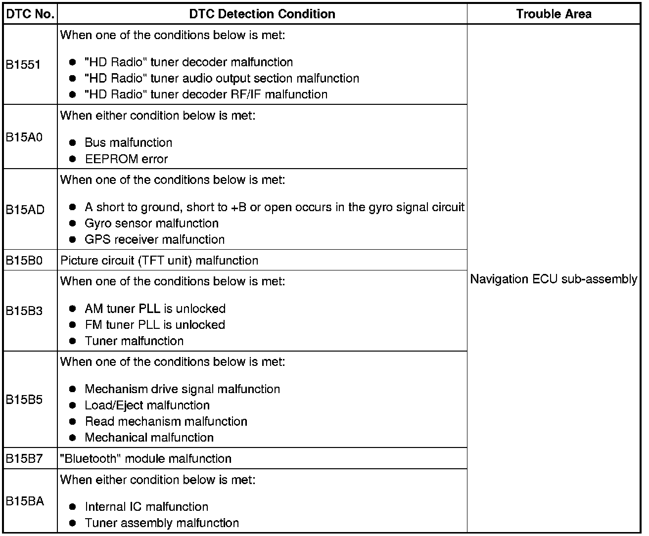 These DTCs are stored when a malfunction occurs in the navigation ECU sub-assembly.
