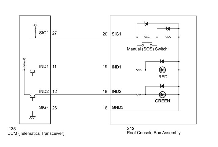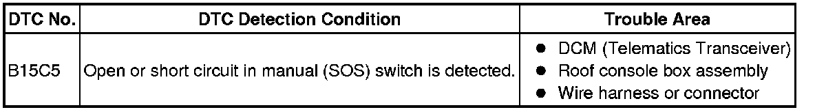 This DTC is set when the DCM (Telematics Transceiver) detects an open or short circuit in the manual (SOS) switch.