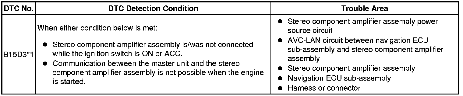 When an AVC-LAN communication error occurs between the navigation ECU sub-assembly and stereo component amplifier assembly, this DTC will be stored.