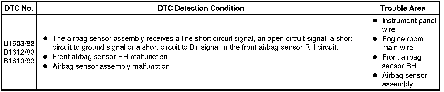 These DTCs are stored when a malfunction is detected in the front airbag sensor RH circuit.