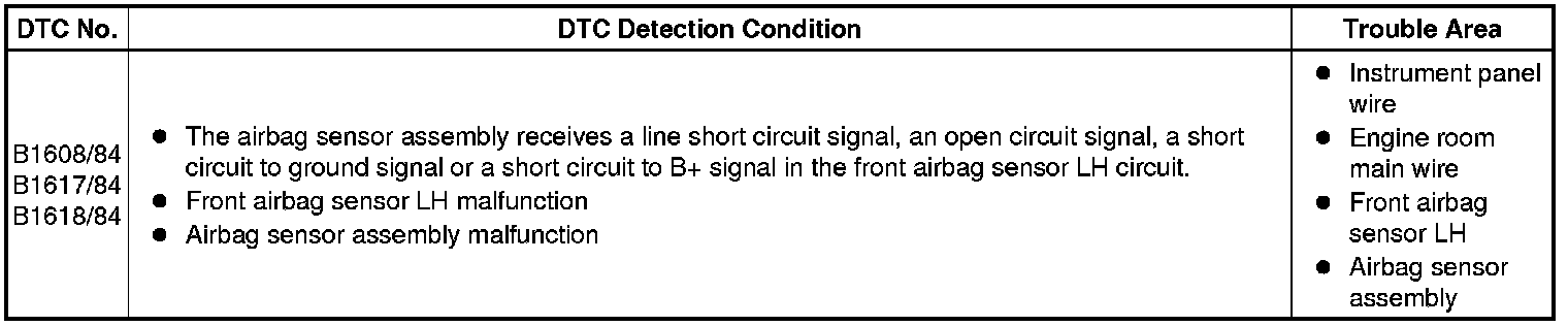 These DTCs are stored when a malfunction is detected in the front airbag sensor LH circuit.