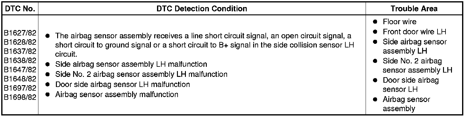 SUPPLEMENTAL RESTRAINT SYSTEMS: AIRBAG SYSTEM (for Separate Type Yaw Rate Sensor): B1627/82, B1628/82, B1637/82, B1638/82, B1647/82, B1648/82, B1697/82, B1698/82: Lost communication with Side Airbag Sensor LH