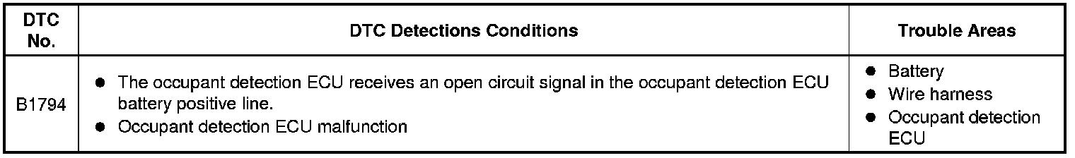 DTC B1794 is stored when a malfunction is detected in the occupant detection ECU battery positive line.