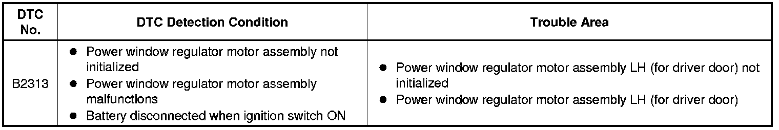 When the ECU determines that the power window regulator motor assembly LH (for driver door) has not been initialized, DTC B2313 is stored.