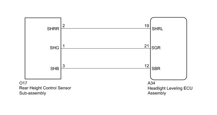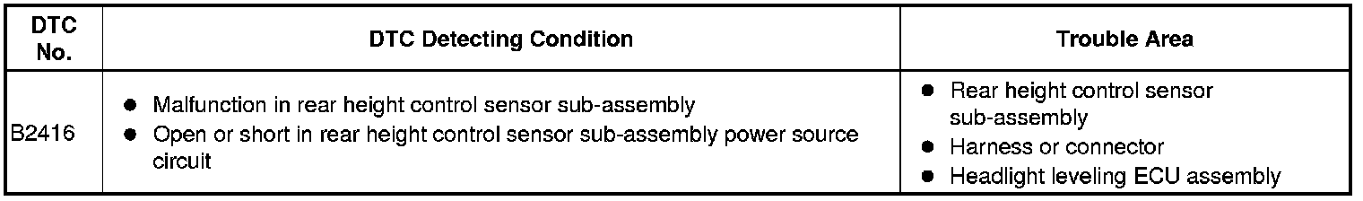 The DTC is stored when the headlight leveling ECU assembly detects malfunctions in the rear height control sensor sub-assembly power source or rear height control sensor sub-assembly.