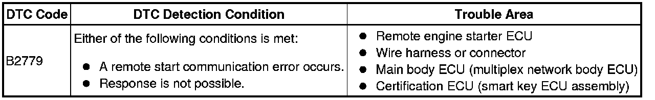 If communication between the remote engine starter ECU and certification ECU (smart key ECU assembly) cannot be performed even if a remote engine start operation is performed to try changing the power source mode to on (IG) or start the engine, this DTC is stored.