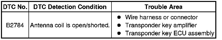 THEFT DETERRENT / KEYLESS ENTRY: ENGINE IMMOBILISER SYSTEM (w/o Smart Key System): B2784: Antenna Coil Open / Short