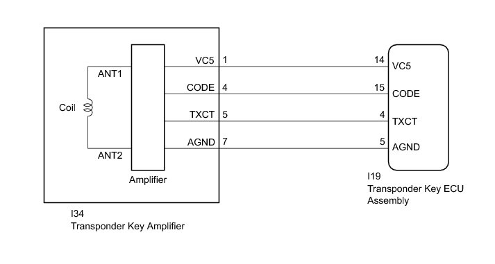 The transponder key coil is built into the transponder key amplifier and receives a key code signal from the transponder chip in the key. This signal is amplified by the amplifier, then it is output to the transponder key ECU assembly.