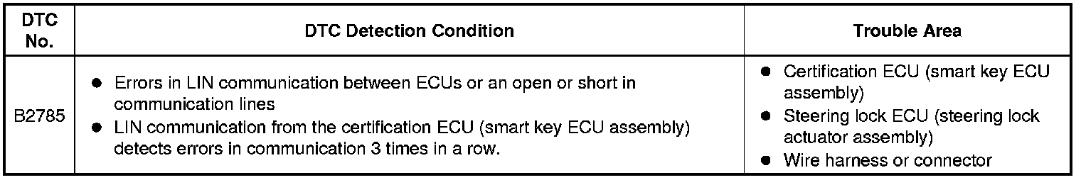 The certification ECU (smart key ECU assembly) monitors communication between all the ECUs connected to the certification bus lines. When the certification ECU (smart key ECU assembly) detects errors in communication with all the ECUs connected to the certification bus lines at a set interval and 3 times in a row, DTC B2785 will be stored.