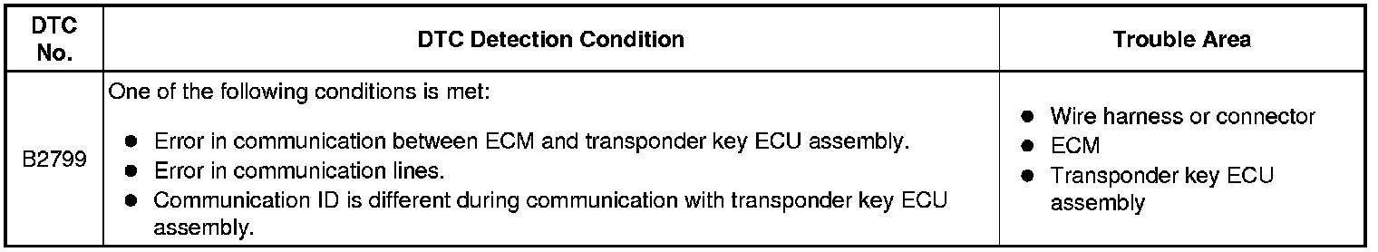 This DTC is stored when one of the following occurs: 1) the ECM detects errors in its own communication with the transponder key ECU assembly; 2) the ECM detects errors in the communication lines; or 3) the ECU communication ID between the transponder key ECU assembly and ECM is different and an engine start is attempted.