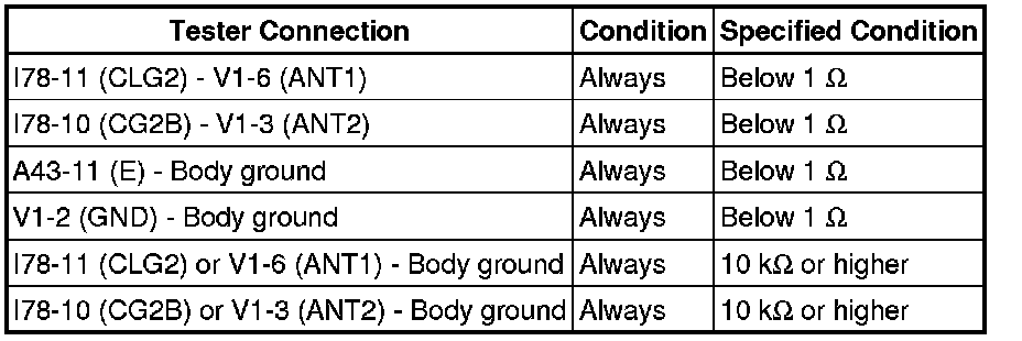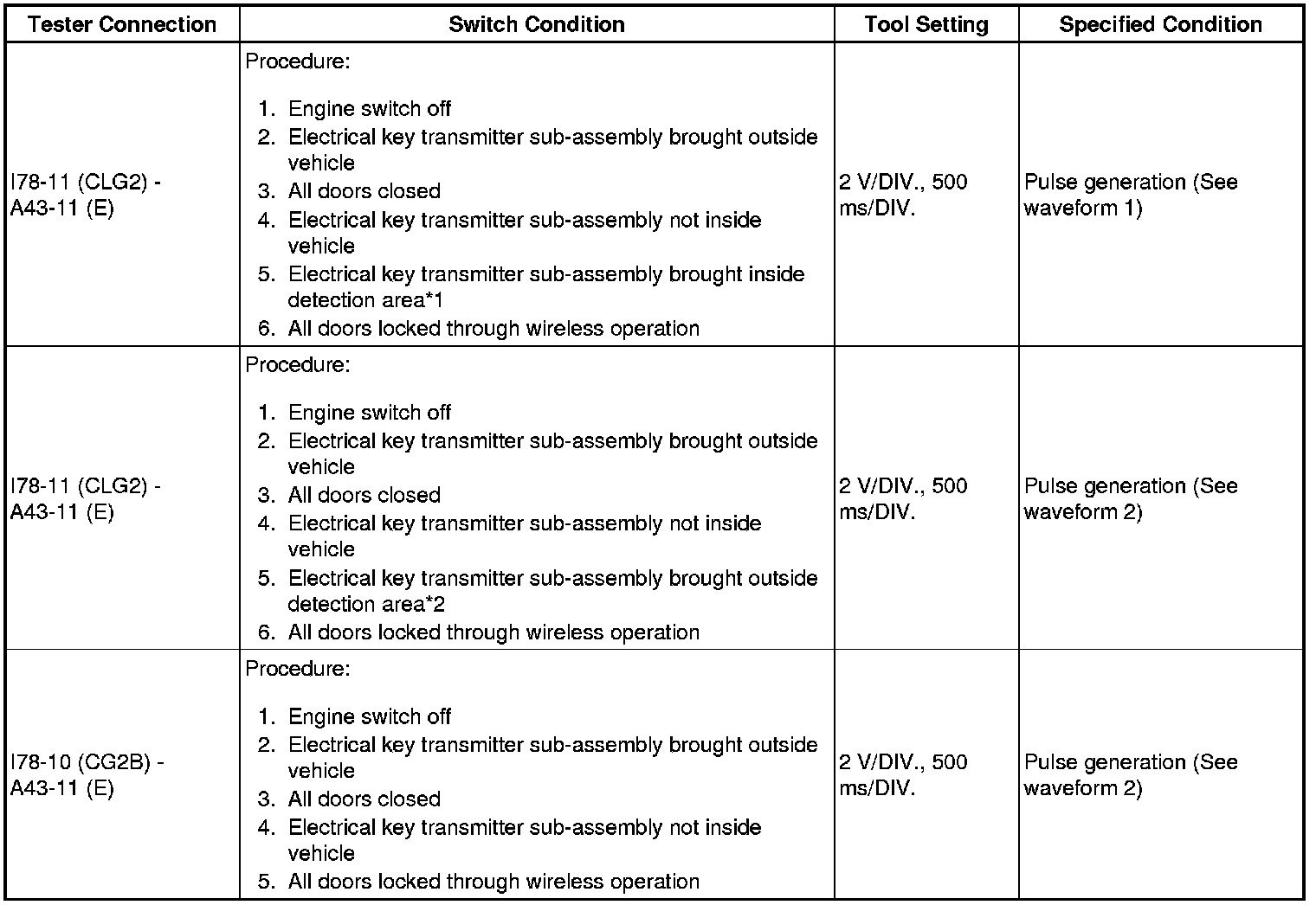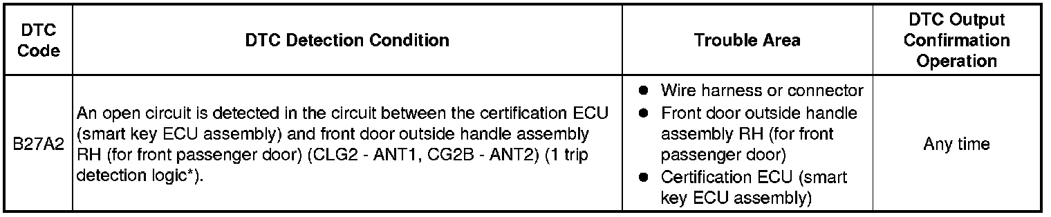 The certification ECU (smart key ECU assembly) generates a request signal and transmits the signal to the front door outside handle assembly RH (for front passenger door) [electrical key antenna] at intervals of 0.25 seconds. For the front door outside handle assembly RH (for front passenger door) [electrical key antenna] to detect when the electrical key transmitter sub-assembly is brought close to the vehicle, a signal requesting a response from the electrical key transmitter sub-assembly is transmitted within approximately 1 m (3.28 ft.) of the front passenger door at intervals of 0.25 seconds. DTC B27A2 is stored by the certification ECU (smart key ECU assembly) when an open circuit is detected between the certification ECU (smart key ECU assembly) and front door outside handle assembly RH (for front passenger door) [electrical key antenna] (between terminals CLG2 and ANT1, or terminals CG2B and ANT2).