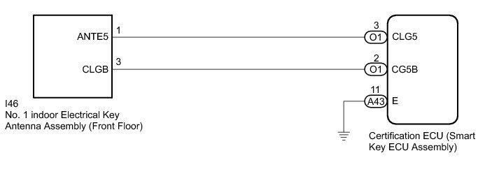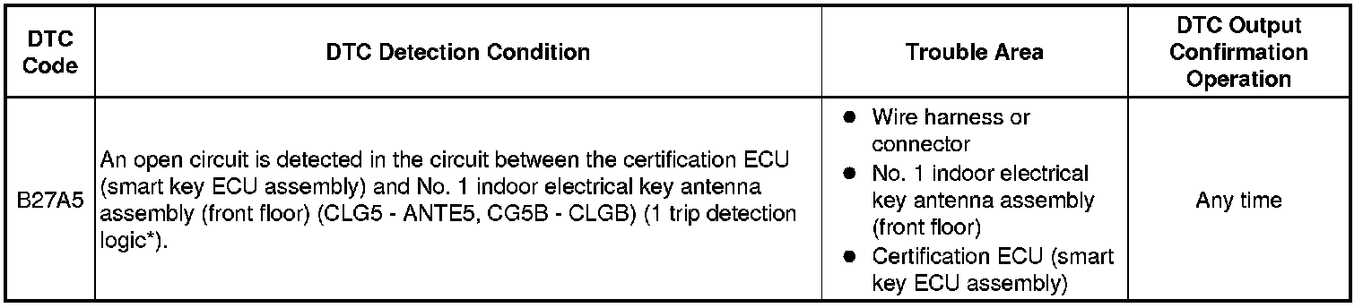 The certification ECU (smart key ECU assembly) generates a request signal and transmits the signal to the No. 1 indoor electrical key antenna assembly (front floor). For the No. 1 indoor electrical key antenna assembly (front floor) to detect when the electrical key transmitter sub-assembly is inside the vehicle, the signal from the certification ECU (smart key ECU assembly) requesting a response from the electrical key transmitter sub-assembly is transmitted inside the vehicle. DTC B27A5 is stored by the certification ECU (smart key ECU assembly) when an open circuit is detected between the certification ECU (smart key ECU assembly) and No. 1 indoor electrical key antenna assembly (front floor) (between terminals CLG5 and ANTE5, or terminals CG5B and CLGB).
