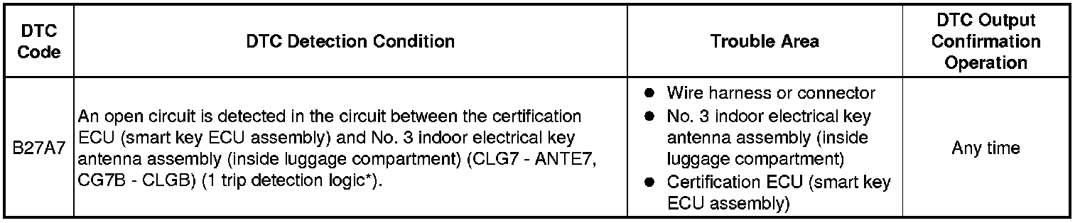 The certification ECU (smart key ECU assembly) generates a request signal and transmits the signal to the No. 3 indoor electrical key antenna assembly (inside luggage compartment). For the No. 3 indoor electrical key antenna assembly (inside luggage compartment) to detect when the electrical key transmitter sub-assembly is inside the luggage compartment, the signal from the certification ECU (smart key ECU assembly) requesting a response from the electrical key transmitter sub-assembly is transmitted inside the luggage compartment. DTC B27A7 is stored by the certification ECU (smart key ECU assembly) when an open circuit is detected between the certification ECU (smart key ECU assembly) and No. 3 indoor electrical key antenna assembly (inside luggage compartment) (between terminals CLG7 and ANTE7, or terminals CG7B and CLGB).