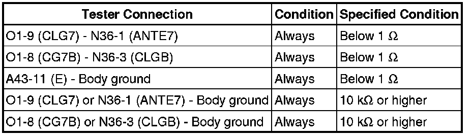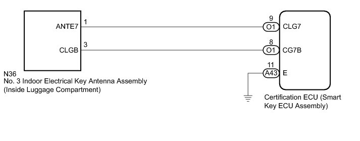 * The No. 3 indoor electrical key antenna assembly (inside luggage compartment) has an antenna coil between ANTE7 and CLGB terminals.
