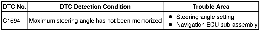 This DTC is stored when the navigation ECU sub-assembly judges that the maximum steering angle has not been memorized (steering angle setting is incomplete).