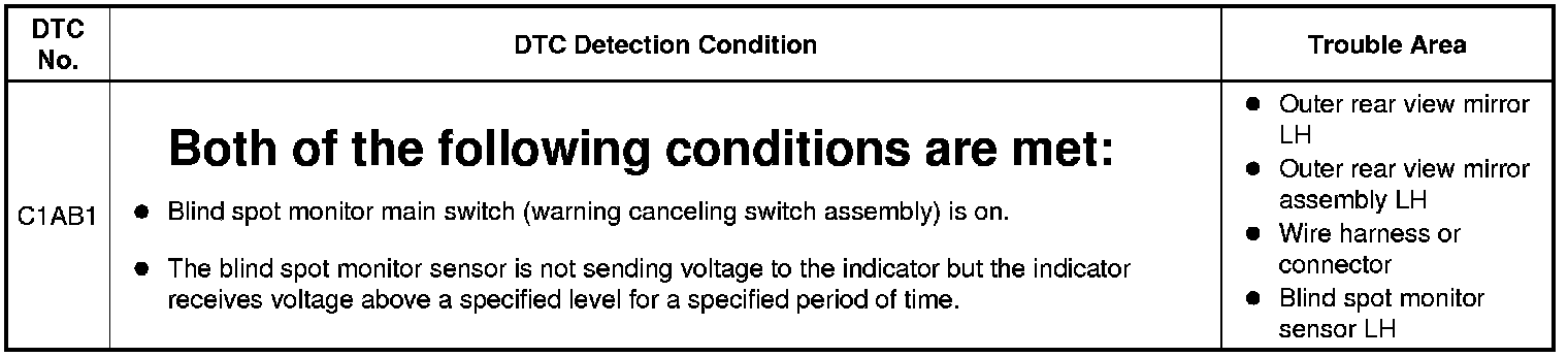 This DTC is stored when the blind spot monitor sensor LH detects a +B short in the outer rear view mirror indicator LH.