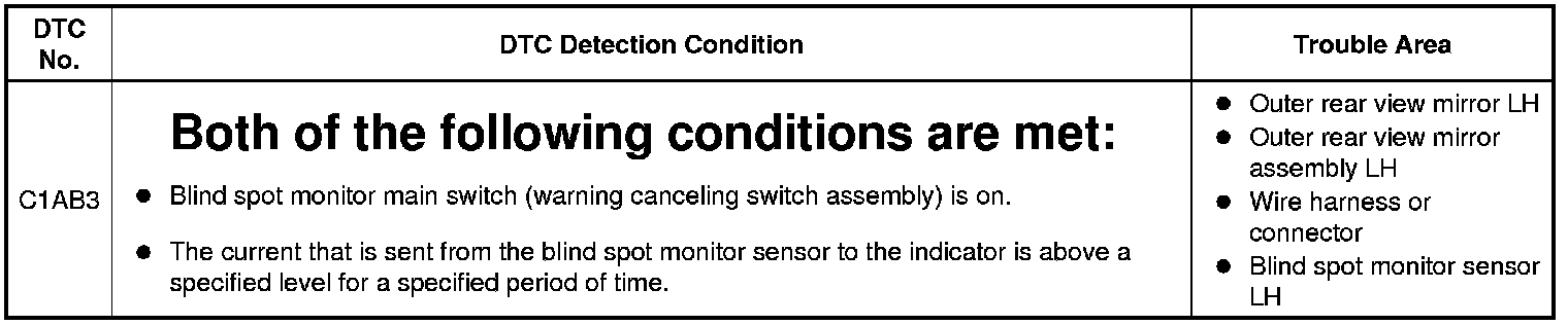 This DTC is stored when the blind spot monitor sensor LH detects a ground short in the outer rear view mirror indicator LH.