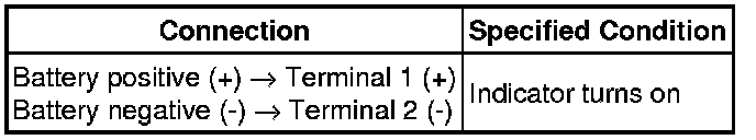 (1) Apply battery voltage to the outer rear view mirror LH (outer rear view mirror indicator LH) and check that the outer rear view mirror indicator turns on.