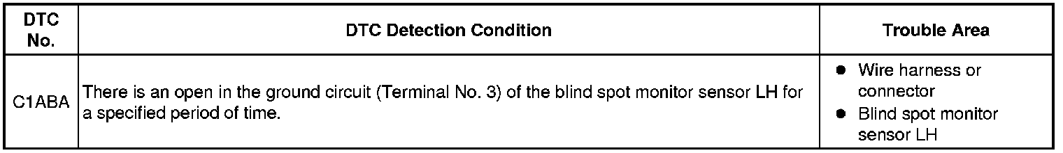 The blind spot monitor sensor LH stores this DTC when terminal No. 3 of the blind spot monitor sensor LH is not connected properly, or the blind spot monitor sensor is not installed on its correct side and the wire harness that is connected to the blind spot monitor main switch (warning canceling switch assembly) is connected to terminal No. 3 of the blind spot sensor LH.