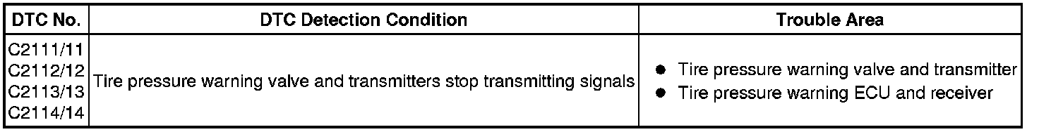 The tire pressure warning valve and transmitters that are installed in the tire and wheel assemblies measure the tire pressures. The measured values are transmitted to the tire pressure warning ECU and receiver in the vehicle as radio waves. The ECU compares the measured air pressure values with the air pressure threshold. When the measured air pressure value is less than this threshold, the warning light in the combination meter assembly illuminates. The tire pressure warning ECU and receiver stores a DTC when the tire pressure warning valve and transmitter stops transmitting signals. The signals can be forcibly transmitted by releasing the tire pressure rapidly. The stored DTC is cleared when signal transmission resumes.