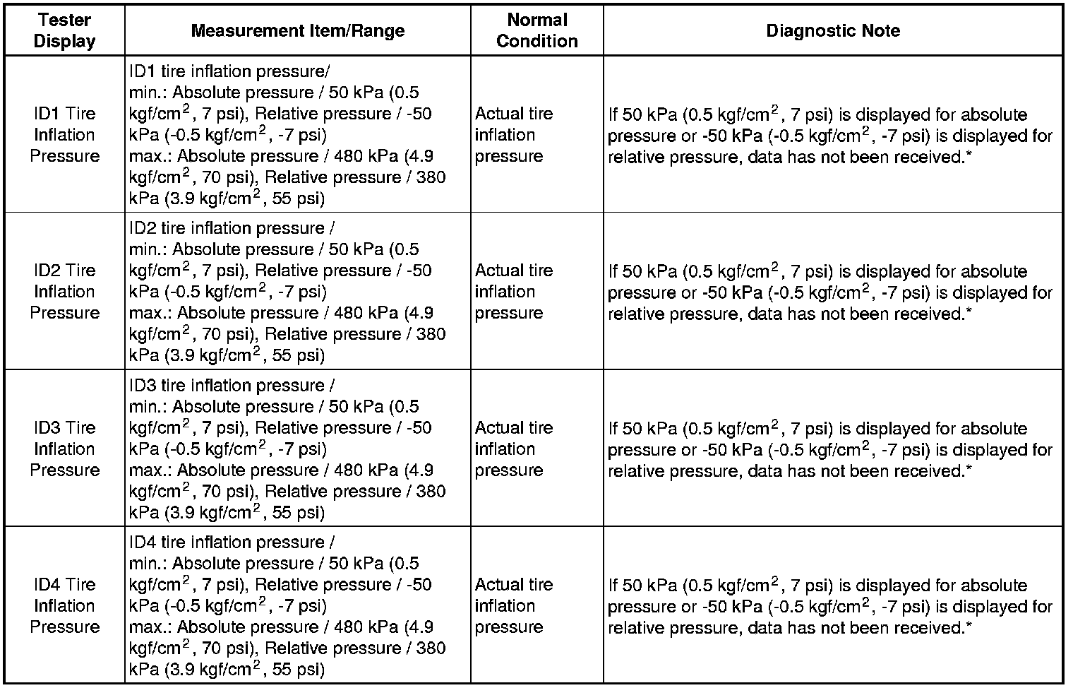 * When the "ID Tire Inflation Pressure" data has not changed, reset the tire pressure to the appropriate specified value and rotate the tire 90 to 270 degrees. Then rapidly release the tire pressure and recheck the data.
