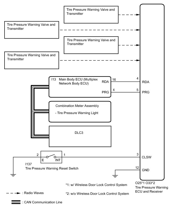 The tire pressure warning valve and transmitters constantly send radio waves to the tire pressure warning ECU and receiver.