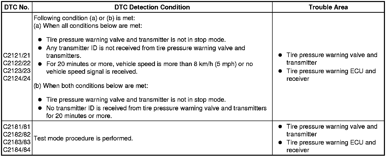 When no transmitter ID is received from a tire pressure warning valve and transmitter for a total of 20 minutes while the vehicle speed is more than 8 km/h (5 mph), or no transmitter ID is received from all the tire pressure warning valve and transmitters for a total of 20 minutes, these DTCs are set.