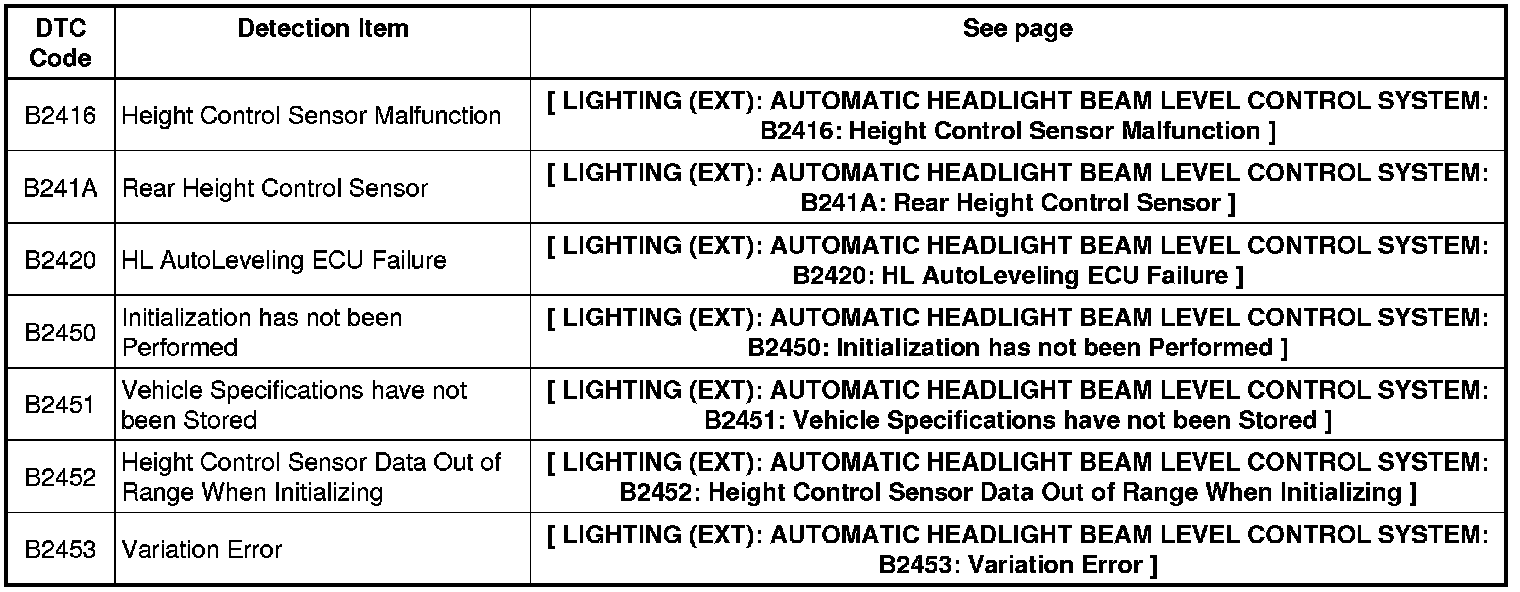 LIGHTING (EXT): AUTOMATIC HEADLIGHT BEAM LEVEL CONTROL SYSTEM: DIAGNOSTIC TROUBLE CODE CHART