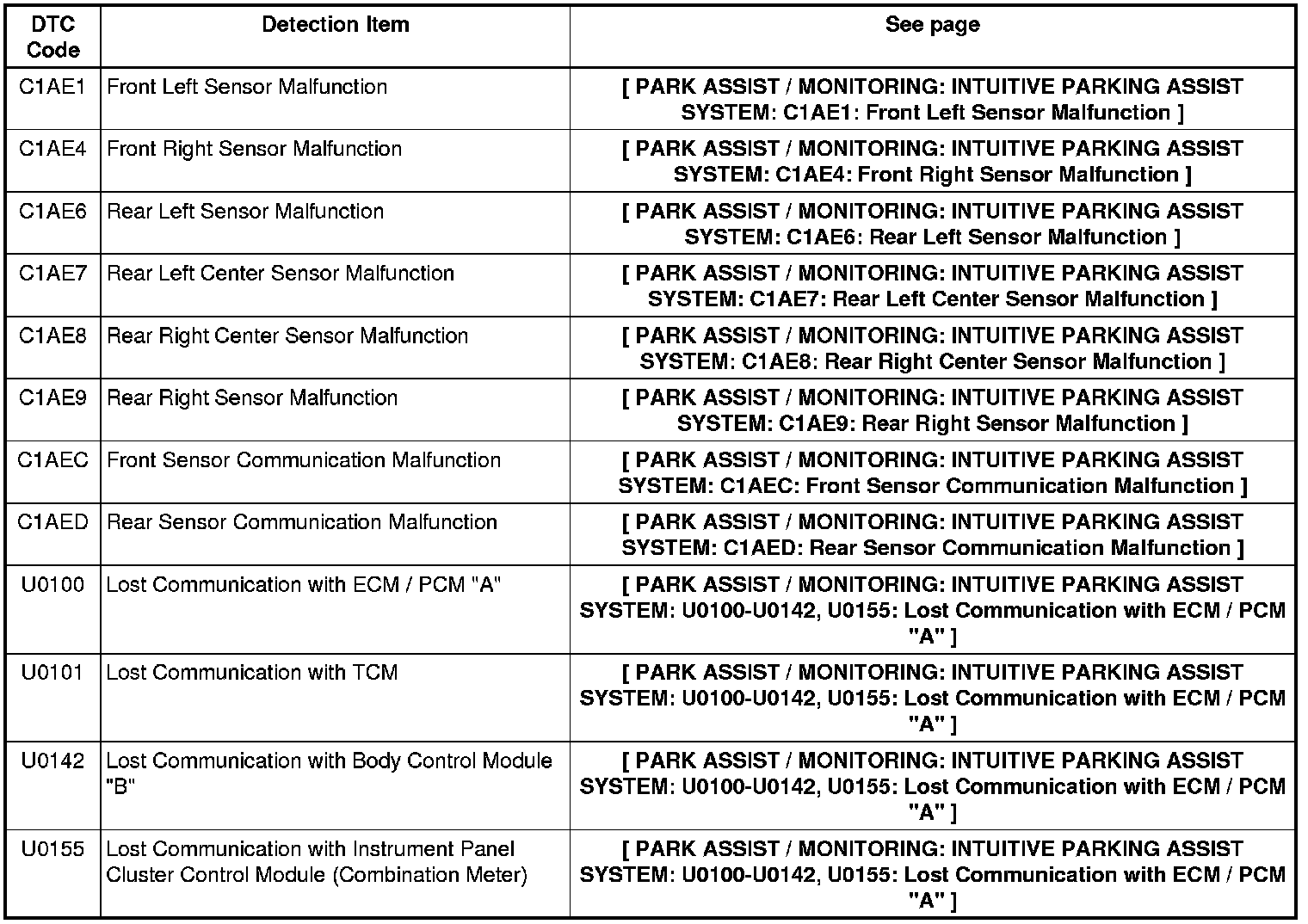 PARK ASSIST / MONITORING: INTUITIVE PARKING ASSIST SYSTEM: DIAGNOSTIC TROUBLE CODE CHART