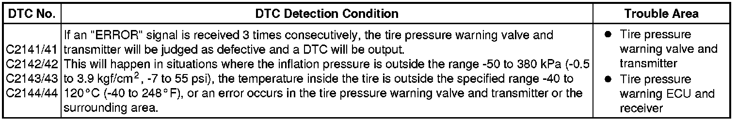 When the internal circuit of a tire pressure warning valve and transmitter is malfunctioning, one of these DTCs is output.