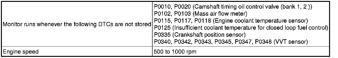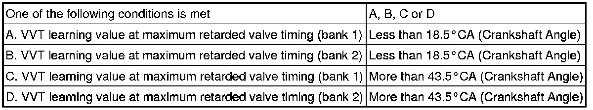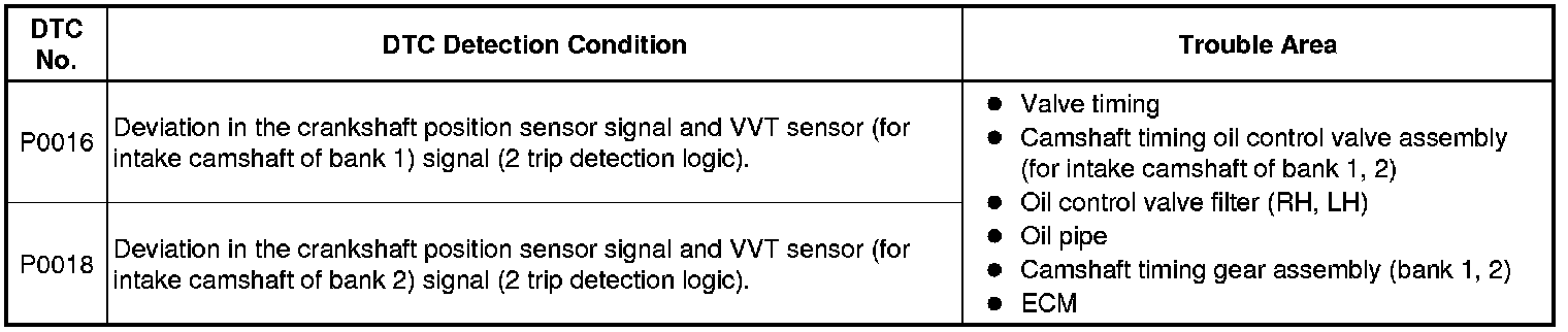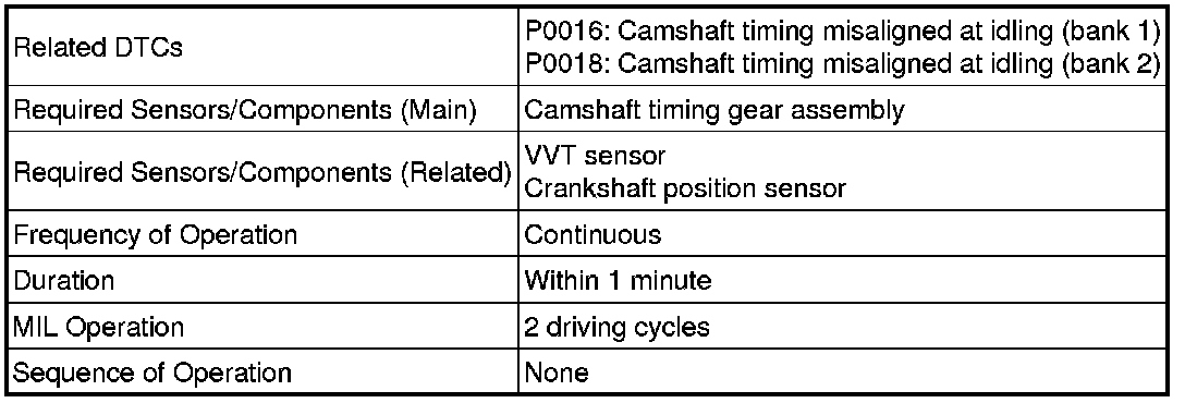 To monitor the correlation of the intake camshaft position and crankshaft position, the ECM checks the VVT learned value while the engine is idling. The VVT learned value is calibrated based on the camshaft position and crankshaft position. The intake valve timing is set to the most retarded angle while the engine is idling. If the VVT learned value is out of the specified range in consecutive driving cycles, the ECM illuminates the MIL and stores DTC P0016 (bank 1) or P0018 (bank 2).
