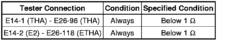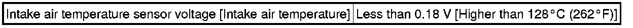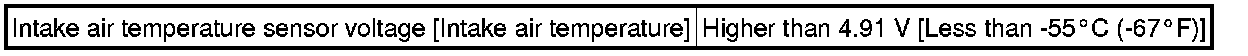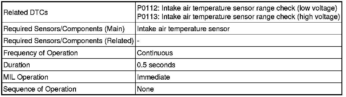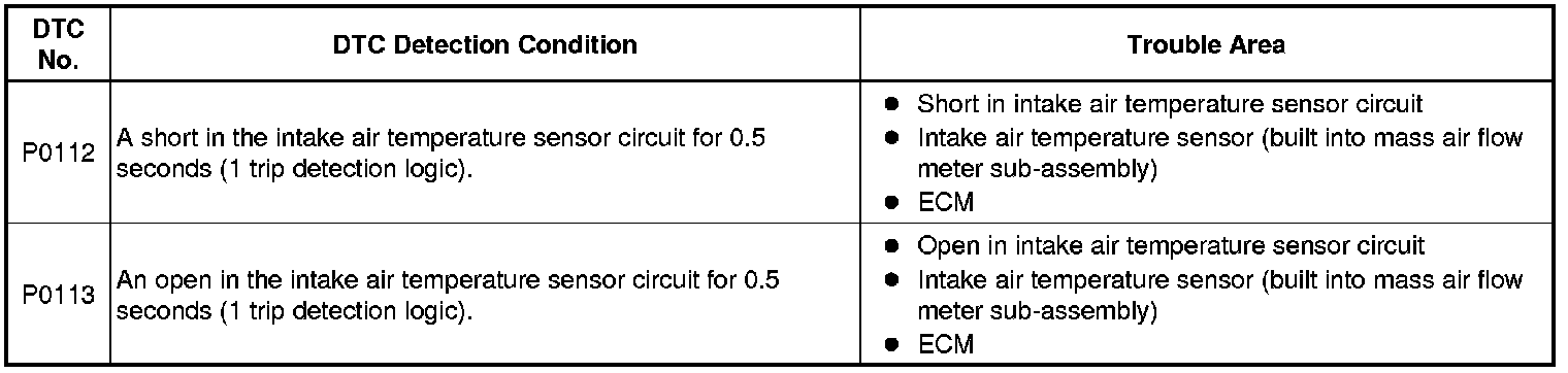 If the sensor output voltage is higher than 4.91 V for 0.5 seconds or more, the ECM determines that there is an open in the intake air temperature sensor circuit, and stores DTC P0113. Conversely, if the output voltage is less than 0.18 V for 0.5 seconds or more, the ECM determines that there is a short in the sensor circuit, and stores DTC P0112.