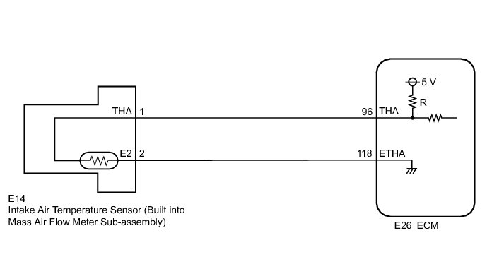 - The intake air temperature sensor is powered by a 5 V supply from the THA terminal of the ECM, via resistor R.
