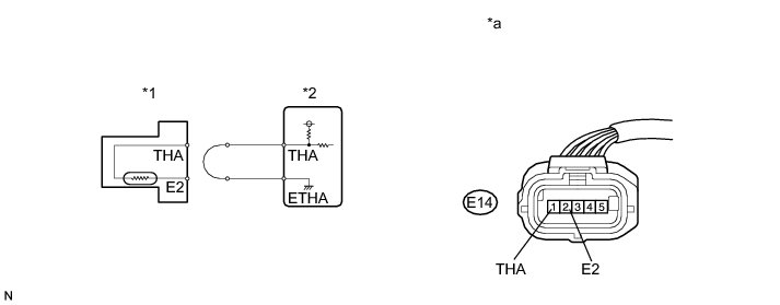 (b) Connect terminals 1 (THA) and 2 (E2) of the mass air flow meter sub-assembly connector on the wire harness side.