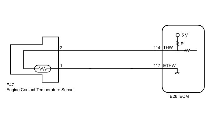 A thermistor, whose resistance value varies according to the engine coolant temperature, is built into the engine coolant temperature sensor. The structure of the sensor and its connection to the ECM are the same as those of the intake air temperature sensor.