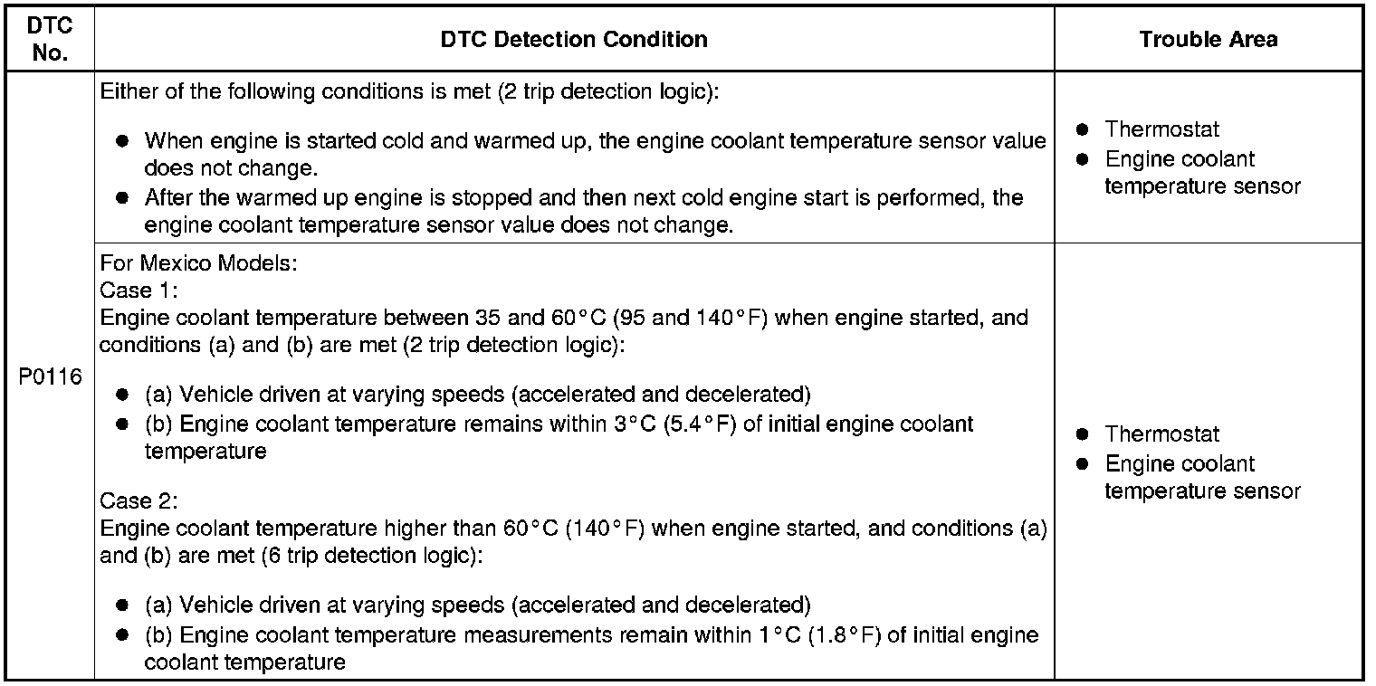 * If any of DTCs P0115, P0117 or P0118 are output simultaneously with DTC P0116, the engine coolant temperature sensor may have an open or a short circuit. Troubleshoot those DTCs first.