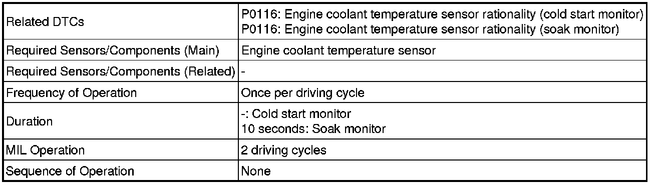 If the engine coolant temperature sensor value does not change after the warmed up engine is stopped and then the next cold engine start is performed, it is determined that a malfunction has occurred. If this is detected in 2 consecutive driving cycles, the MIL is illuminated and a DTC is stored.