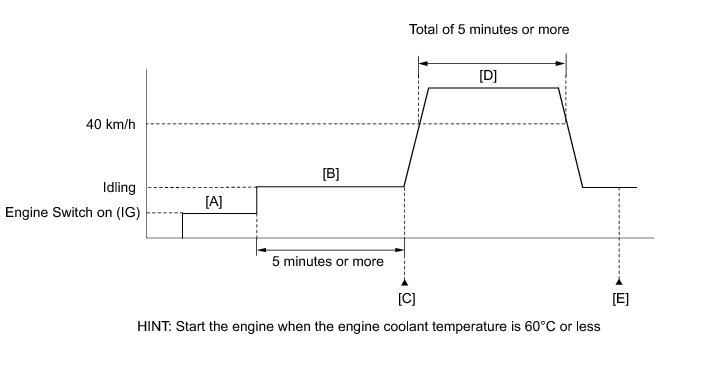 14. Drive the vehicle at 40 km/h (25 mph) or more for a total of 5 minutes or more [D].