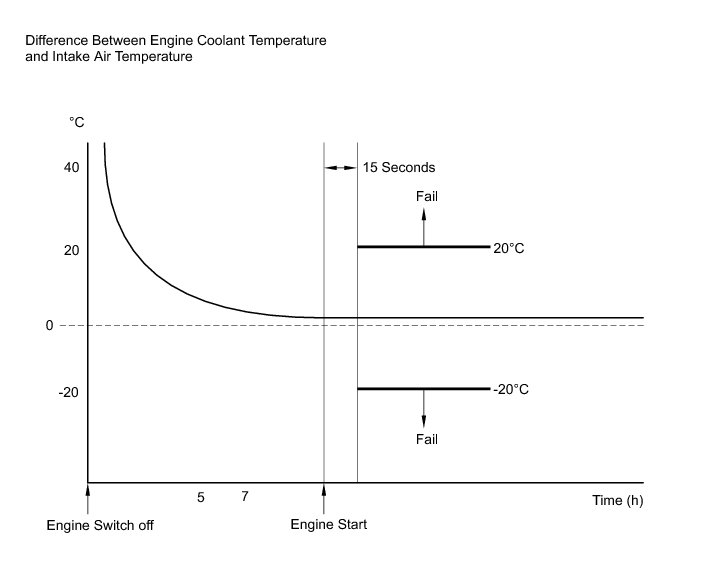 * For diagnosis, in order to duplicate the detection conditions of the DTC, it is necessary to park the vehicle for 7 hours. Parking the vehicle for 7 hours ensures that the actual temperature of the engine coolant temperature and intake air temperature are very similar. When the vehicle has been parked for less than 7 hours, differences in the readings may exist, but this does not necessarily indicate a fault.