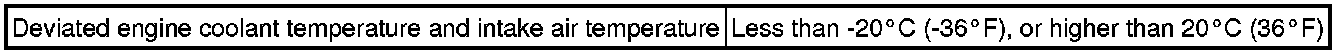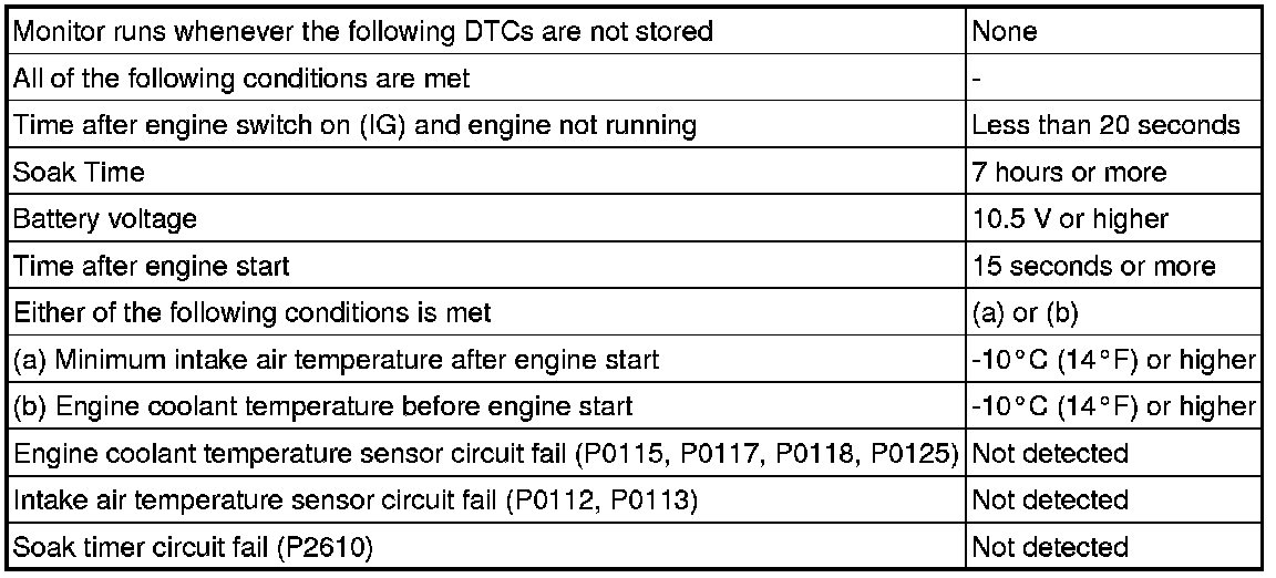 The ECM monitors the difference between the engine coolant temperature and the intake air temperature when the engine is started cold to accurately detect the engine temperature conditions. The monitor runs when the engine is started after 7 hours or more have elapsed since the engine was stopped (engine switch turned off) on the previous trip. If the difference between the engine coolant temperature and the intake air temperature on a cold start exceeds 20°C (36°F), the ECM interprets this as a malfunction in the engine coolant temperature sensor circuit and intake air temperature sensor circuit, and stores the DTC.