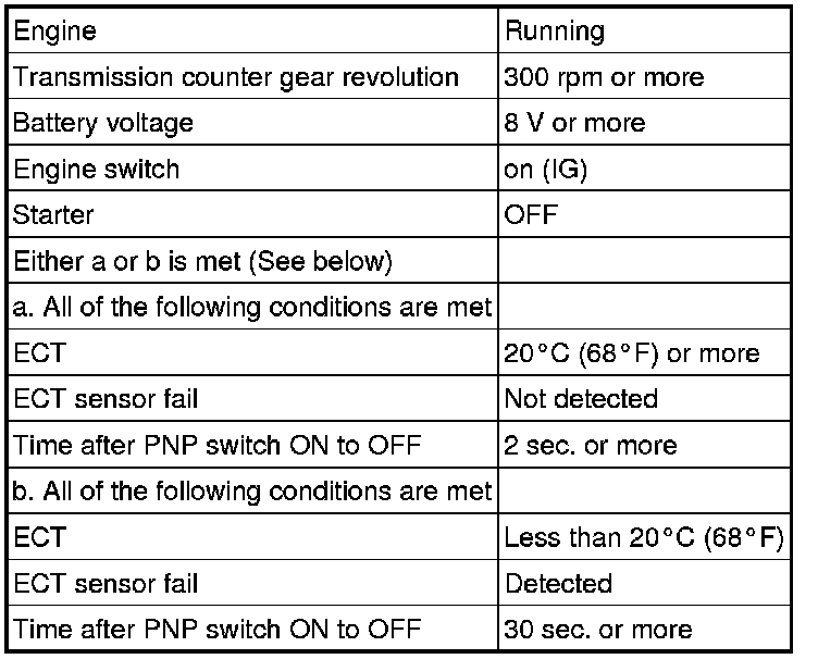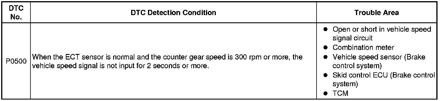 The TCM assumes that the vehicle is being driven when the transmission counter gear indicates more than 300 rpm and over 30 seconds have passed since the park/neutral position switch assembly was turned off. If there is no vehicle speed signal with these conditions satisfied, the TCM concludes that there is a vehicle speed signal malfunction. The TCM will turn on the MIL and a DTC will be set.