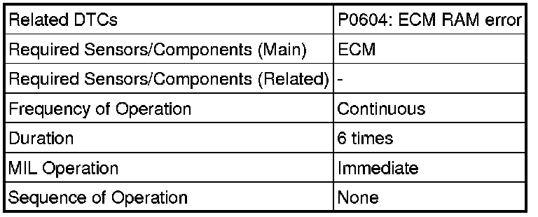The ECM continuously monitors its internal memory status. This self-check ensures that the ECM is functioning properly. It is diagnosed by internal "mirroring" of the main CPU and sub CPU to detect Random Access Memory (RAM) errors. If outputs from these CPUs are different and deviate from the standard, the ECM illuminate the MIL and stores a DTC immediately.