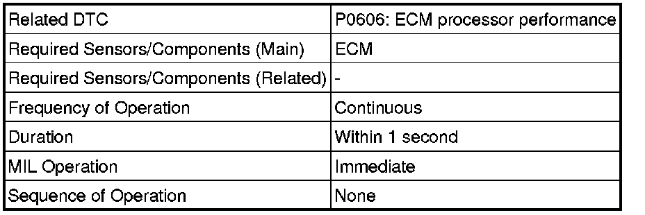 The ECM continuously monitors its main and sub CPUs. This self-check ensures that the ECM is functioning properly. If outputs from these CPUs are different and deviate from the standards, the ECM illuminate the MIL and stores the DTC immediately.