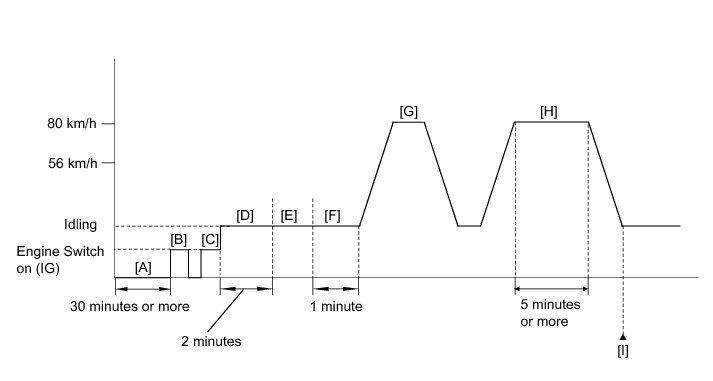 11. Drive the vehicle at 56 to 80 km/h (35 to 50 mph) for 5 minutes or more [H].